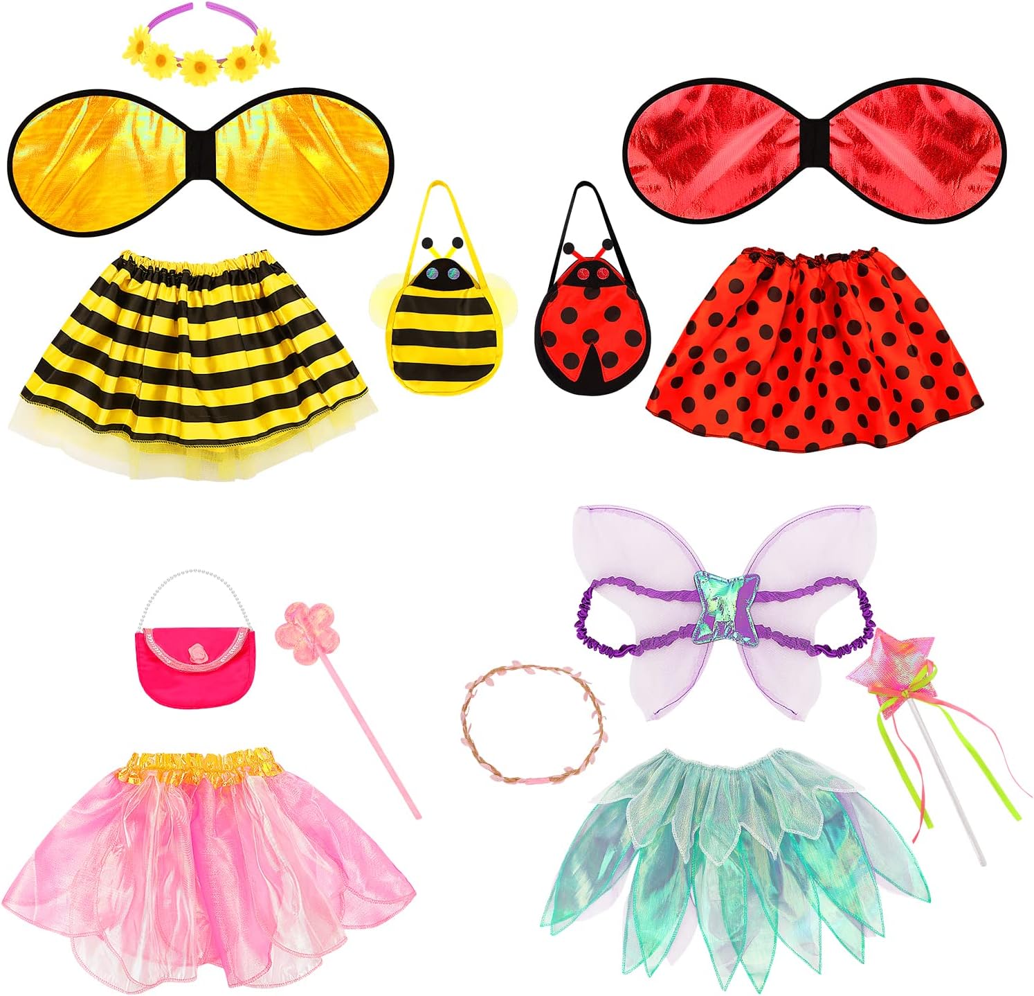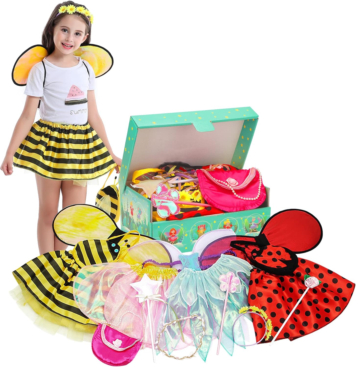 Fedio Girls Princess Dress up Trunk Pretend Play Costume Set — Ladybug, Bee, Pink Fairy,Purple Fairy